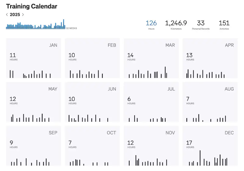 In the training calendar, you can see the impact of the winter months, the October Achilles struggles, and the December last ditch effort to get the numbers back up a bit.
