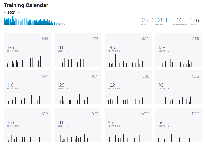 Thanks to Strava’s handy training calendar shown below, we can see that I spent 125 hours last year (mostly, about 4 hours was spent on hiking just over 20km) running a bit over 1300km.