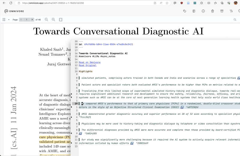 - Tried out Omnivore’s PDF annotation support, see screenshot below. Pretty impressive, and very cool that the highlights sync into my Emacs-based notes setup via markdown. Have slightly mixed feelings, because now will have to come up with new rule for when a paper goes into Zotero (fully local, full citations, but no automatic highlights sync) and when it goes into Omnivore (good sort of cloud but not local, no full citations, automatic sync into my notes)