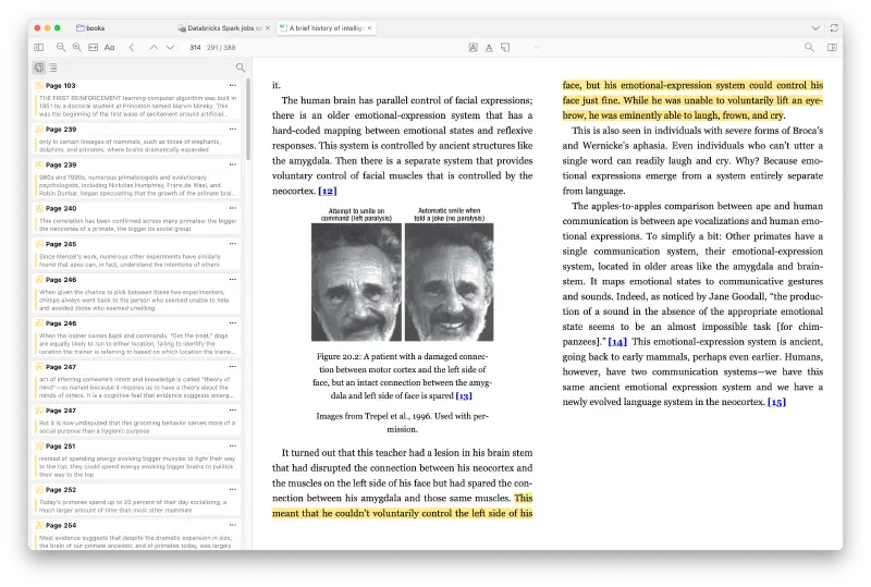 Some non-fiction books deserve even closer attention, like Max Bennett’s A Brief History of Intelligence, which I started reading on my Kindle but then completed on my laptop, using the fantastic epub reader in Zotero. With this tool I can make highlights and notes to my heart’s content.